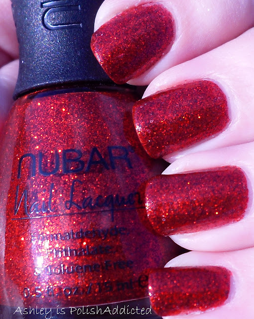 I am so in love with the polish I have to show you today!!! It's red and sparkly, my favorite combination!!! This is my very first time using nubar and I am very impressed!! I think this bottle and cap are my new favorite!! They fit in my hand easily and were very easy to use. The formula was amazing! An EASY two-coater!