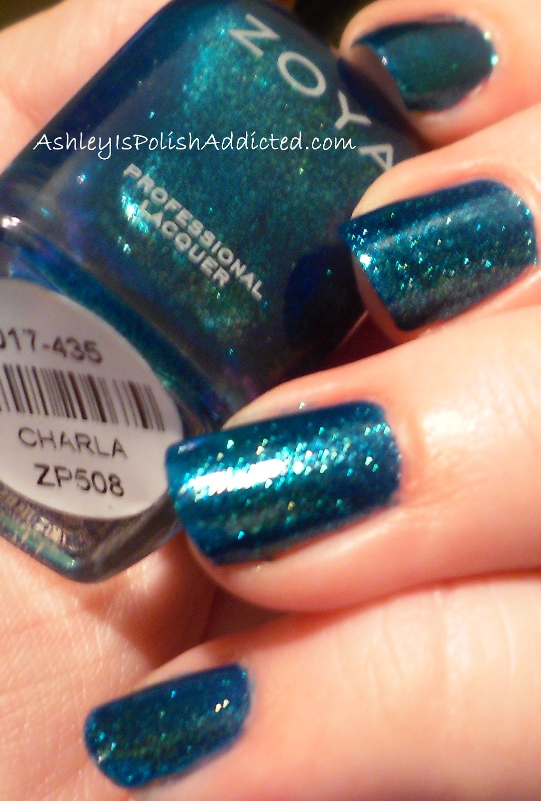 Charla is an AMAZING teal glass fleck polish, EVERYONE needs Charla. There is really nothing else to say, just look at the pics. LOL It reminds me of a mermaid's tail. My camera hates anything overly shimmery so they are a little blurry. This is 3 coats with top coat. Two would probably suffice but I had slight VNL in the pics. But it dries really quickly, so 3 isn't a problem.
