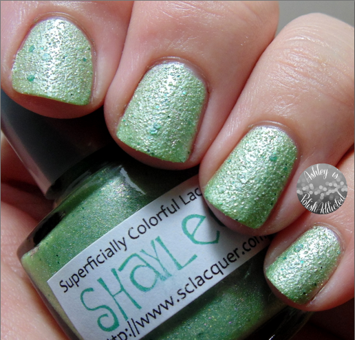 "Shaylee is inspired by the Fairy princess of the fields from the Celtic/Gaelic mythology. Shaylee is a young fairy princess of harmony and nature. Calm and peaceful and very trustworthy. This polish is a light, soft green polish with green little glitter and micro flakes and green and gold shimmer."